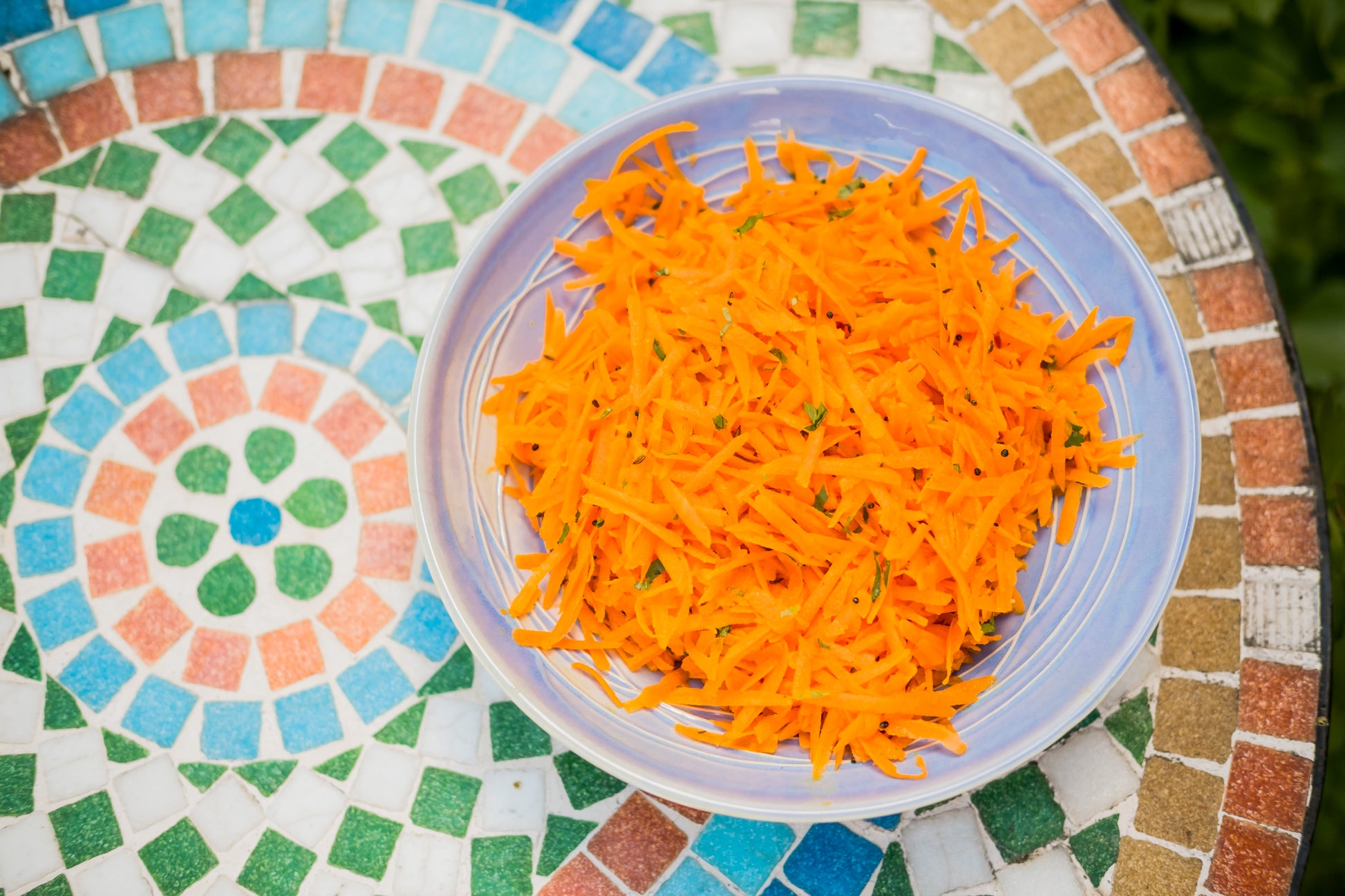 Grated carrot is marinated in lemon juice, a little salt and sugar and the spices which are tempered in oil. Finish this recipe with a garnish of fresh coriander.