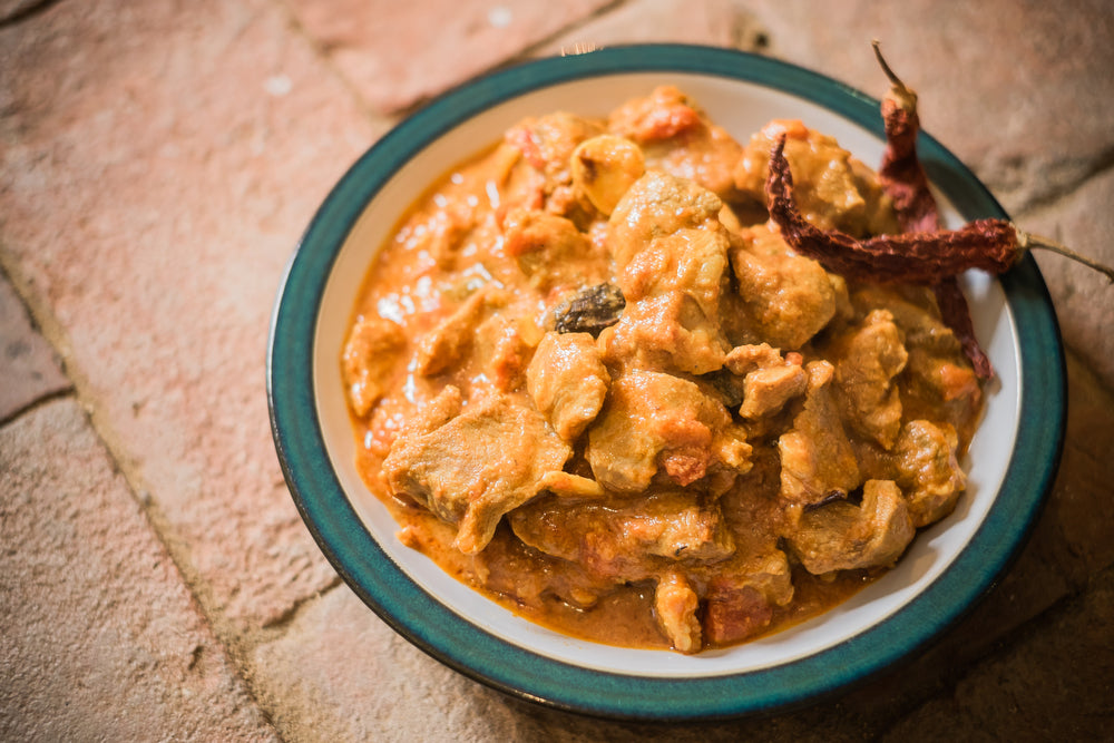 Rogan Josh is often associated with a bright red colour. Traditionally this was obtained from a natural dye called Ratan Jot, which is the dried root of the Alkanet plant. This could be where the name Rogan Josh comes from. Other sources suggest the name could be from ‘roghan’ - red and ‘gosht’ - meat. Tomato puree is used in Rafi’s recipe in place of the rattan jot, providing richness, depth of flavour and colour.